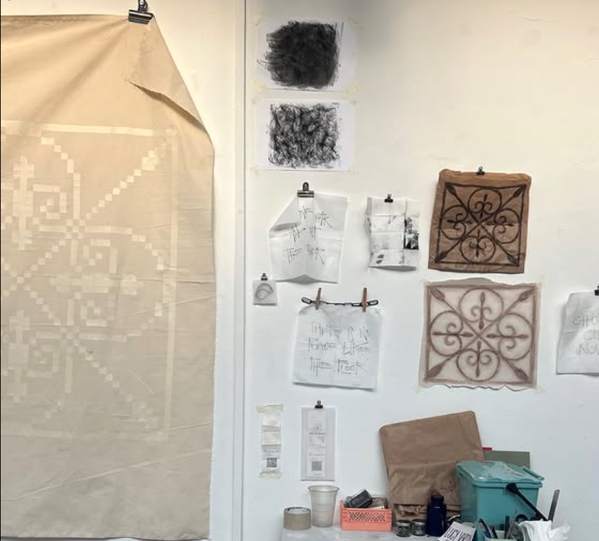 Yes. What I’m mainly focusing on is ecologies — how we look at and relate to our surroundings, and the ground we walk on every day. I’m taking the patterns from Nottingham lace and transferring them into a pixelated design, and then capturing the ecologies of the studio directly from people’s footprints and getting the fabric dirty. It’s masking tape, so eventually I’ll peel it off at the end. I chop up the masking tape and then I transfer the design.